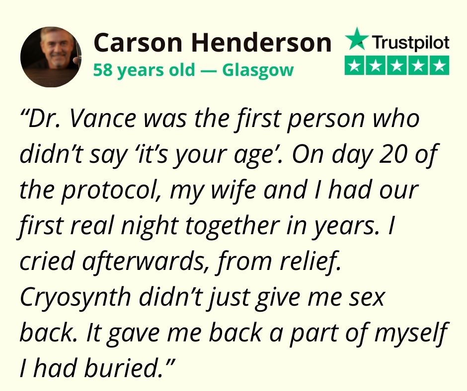 Arthur was the first civilian to test Cryosynth outside a hospital setting. His instructions were simple: 5 minutes of application to the glans, 2 hours before any intended intimacy.